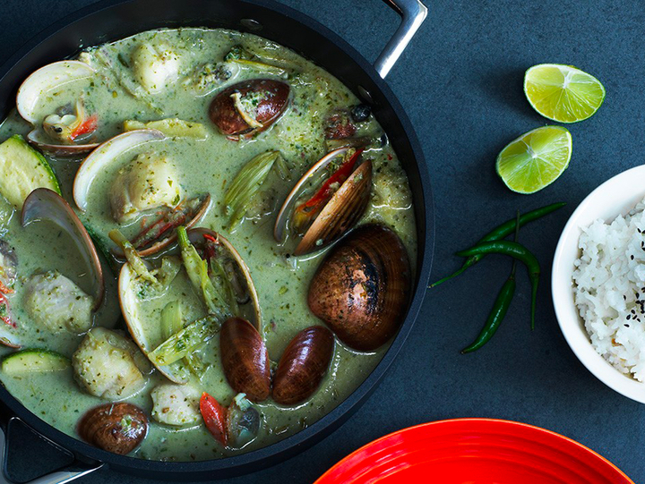 - Mettre l’huile dans une sauteuse bord droit Le Creuset chaude et grillez le curry vert jusqu'à ce qu’il commence à répandre son parfum.
