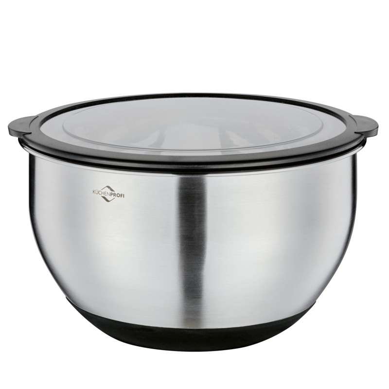 Le Cul de Poule Bol Inox Gradué Antidérapant 24 cm 4,8 l + couvercle hermétique Küchenprofi est une bassine demi-sphérique parfaite pour battre les œufs en neige ou monter des crèmes chantilly, car sa forme assure une excellente aération lors du mélange.
