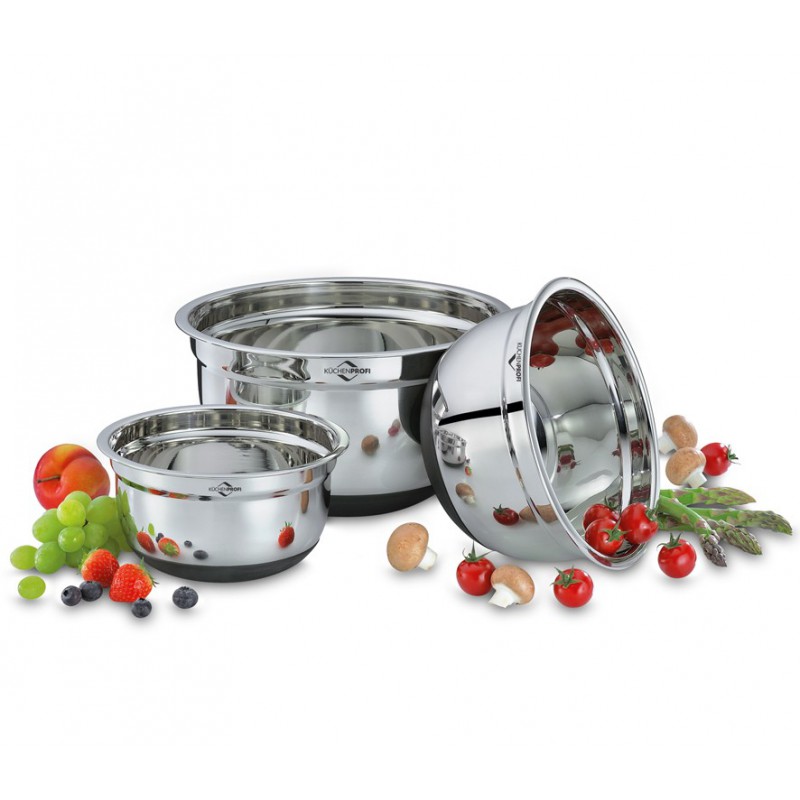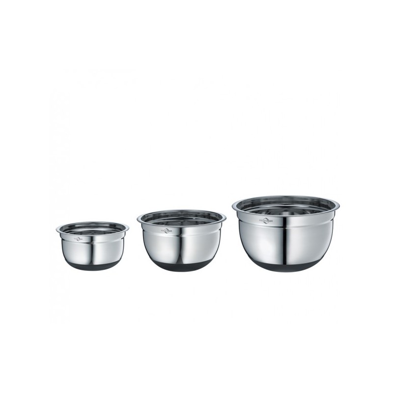 Le set de 3 bols en inox antidérapants Kuchenprofi est un set de 3 culs de poule en inox. Les Bols Inox Antidérapants Küchenprofi sont des bassines demi-sphériques parfaites pour battre les œufs en neige ou monter des crèmes chantilly, car leur forme assure une excellente aération lors du mélange.