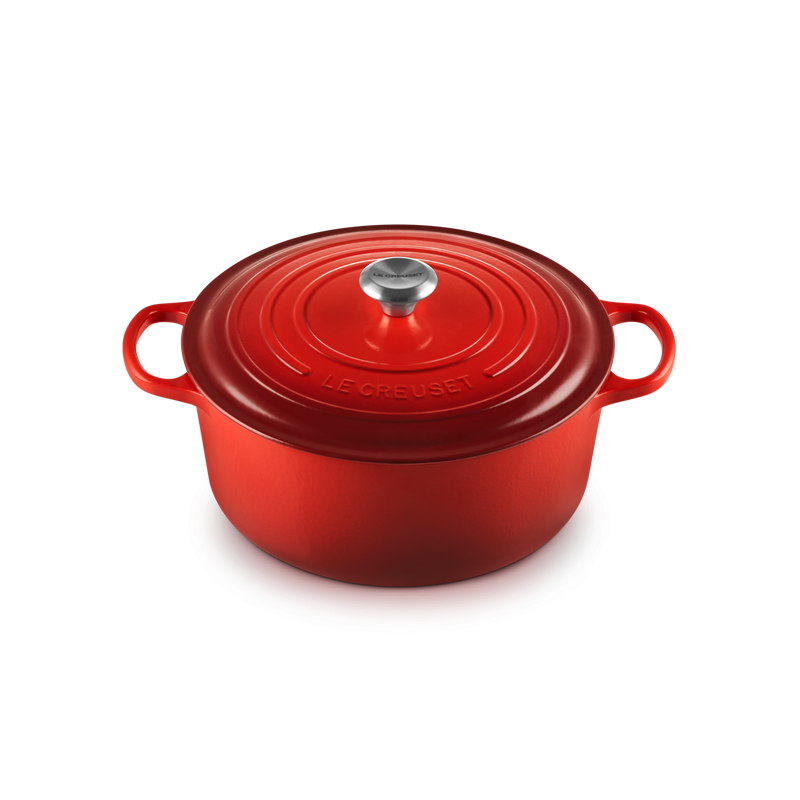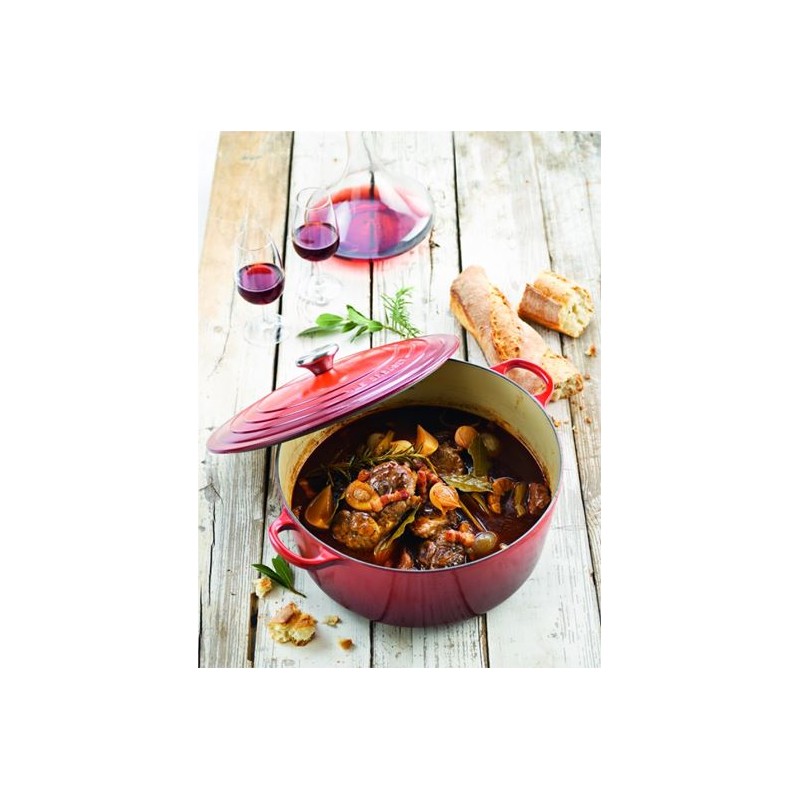 La Cocotte en Fonte Ronde Signature 12 l (34 cm) Rouge Cerise Le Creuset est idéale pour mijoter et vous permet de retrouver les saveurs d’autrefois. Boeuf bourguignon, blanquette de veau, carbonnades, pot au feu, viandes braisées et autres plats traditionnels mijotés n'auront bientôt plus de secret pour vous ! Son bouton en acier inoxydable passe au four sans limite de température. Reconnues depuis des années, les cocottes Le Creuset font la renommée de la marque, grâce à une qualité de fabrication et une précision de cuisson incomparables : les cocottes en fonte permettent une diffusion constante de la chaleur dans toutes les parois, offrant une stabilité de température à l'intérieure de l'ustensile. Sa composition lui permet d'être nettoyée au lave-vaisselle, et son design sera parfait pour une petite soupe au coin du feu en hiver ou un petit déjeuner au jardin en été.