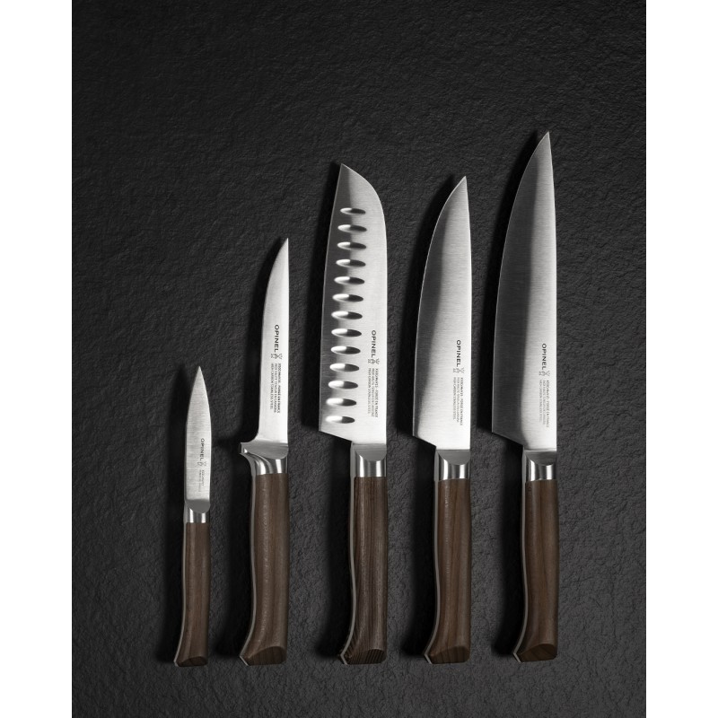 Le Couteau Santoku 17 cm Les Forgés 1890 d'Opinel est un couteau parfait pour toutes vos découpes, et plus particulièrements pour les légumes tel que concombre, courgette, aubergine ou encore les poissons gras, comme la saumon, grâce à ses alvéoles !