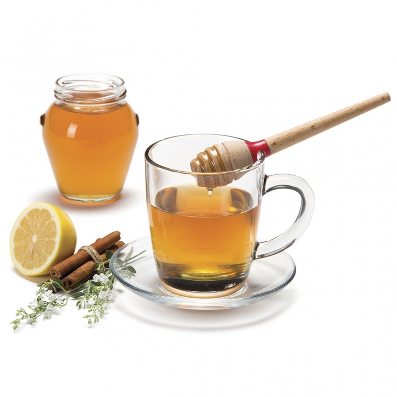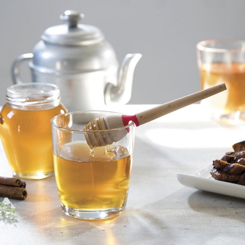 Cette cuillère à miel, fabriquée en bois et en plastique, résiste à des chaleurs allant jusqu'à 120°.