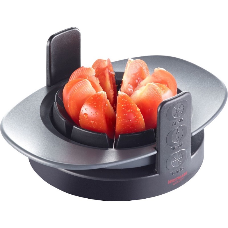 Le Coupe Pomme, Tomate et Mange Westmark est un ustensile de cuisine 3-en-1 qui vous permet de couper vos pommes en 8 en retirant le trognon, de couper vos mangues en 2 en retirant le noyau et de couper vos tomates et autres fruits et légumes en 8.