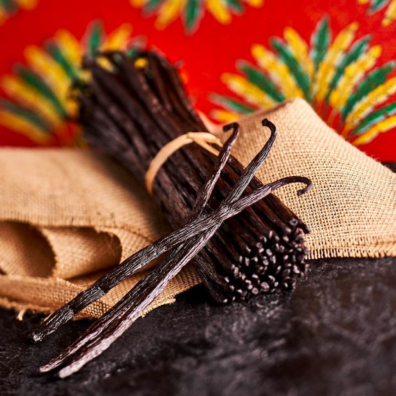 L’orchidée Vanilla Planifolia, fleur de vanille, est encore aujourd’hui pollinisée à la main selon les méthodes ancestrales. Cultivées par une association de planteurs bio, les gousses de vanille verte proviennent des régions de Maroantsetra et Mananara, à l’est de Madagascar.