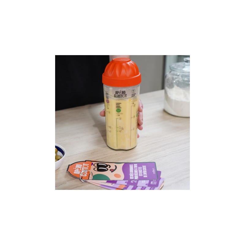 Le Coffret Apéro Cuistot Shaker Gradué en Verre avec Recettes de Cookut permet de préparer 9 savoureuses recettes salées apéritives, sans balance, et sans ustensiles de cuisine :