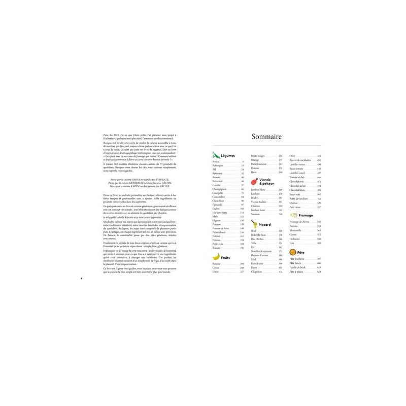 Découvrez "Basiques" d’Isabelle Kanako : 5 recettes pour chacun des 73 aliments incontournables de votre cuisine. Réinventez vos repas avec des idées simples, savoureuses et anti-gaspi !