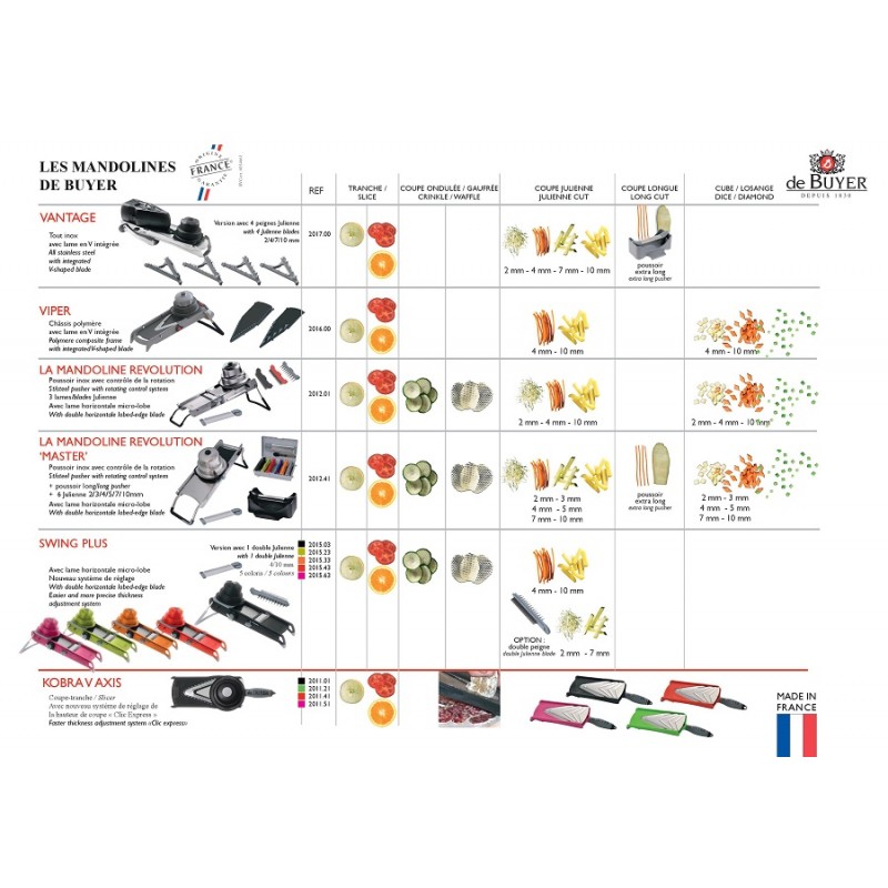 - Contenu du packaging : 1 Mandoline Vantage Standard De Buyer + 3 peignes julienne (4, 7 et 10 mm) + 1 boîte de rangement pour les peignes + 1 poussoir protecteur ergonomique