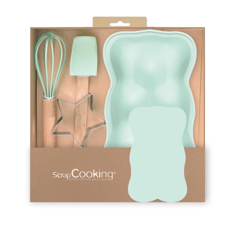 Ces accessoires au coloris vert pastel sont rangés dans un joli coffret kraft. Une idée cadeau parfaite pour futurs pâtissiers en chef et fans d'ours !