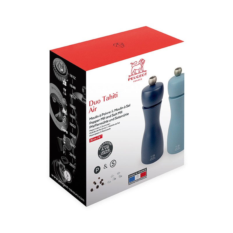 Le duo Tahiti de Peugeot comprend un moulin à poivre 15 cm et un moulin à sel 15 cm dans les tons bleus.