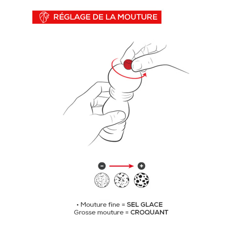 Le moulin à sel est doté du tout nouveau mécanisme Zirlion Peugeot : le 1er mécanisme en zircone, le plus performant au monde. Robuste et résistant, le mécanisme Zirlion, garanti à vie, permet d'obtenir une mouture d'excellente précision, d'un sel glace à la finesse exceptionnelle, au sel croquant. Fabriqué en zircone, il offre une excellente résistance à la corrosion, même dans les zones de forte humidité, et permet de moudre une grande diversité de sels secs.