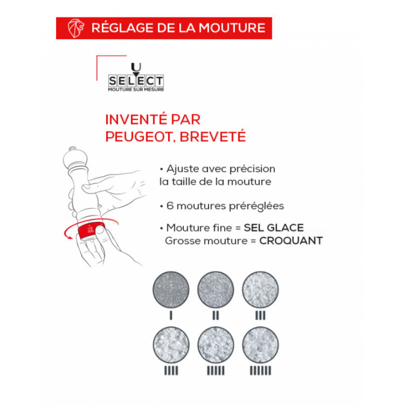 Son système breveté U'Select de réglage de la mouture vous permet de sélectionner précisément la finesse du sel que vous souhaitez. 6 positions de réglages vous sont offertes. Le Paris Moulin à Sel 12 cm Gris Graphite U’Select de Peugeot allie élégance, précision et durabilité pour sublimer toutes vos préparations culinaires.