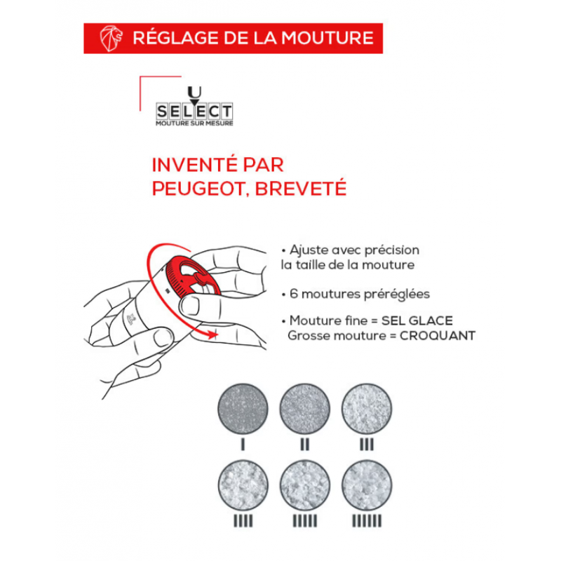 La Salière Maestro de Peugeot possède 6 choix de moutures, du sel glace au sel croquant, grâce à sa fonction U-select.