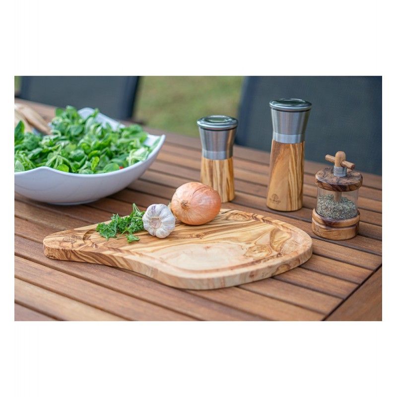 Le bois d’olivier est une matière chaleureuse qui apporte beaucoup de charme et d’authenticité en cuisine et sur la table. Il n’est pas simplement esthétiquement beau, c’est également un matériau naturel très sain reconnu pour ses qualités anti-bactériennes et donc très adapté en cuisine. Son temps de pousse très long le rend extrêmement dur à haute densité, il est même 20% plus dense que le hêtre. Très compact, il a peu de pores. Grâce à l’huile contenue dans le bois, il est en plus totalement étanche à l’humidité et très doux au toucher. Il ne se rompt pas et, enduit d’huile d’olive ou d’arachide, il n’absorbe ni les liquides, ni les bactéries, ni les mauvaises odeurs. Son imperméabilité donne également une haute résistance au tachage.