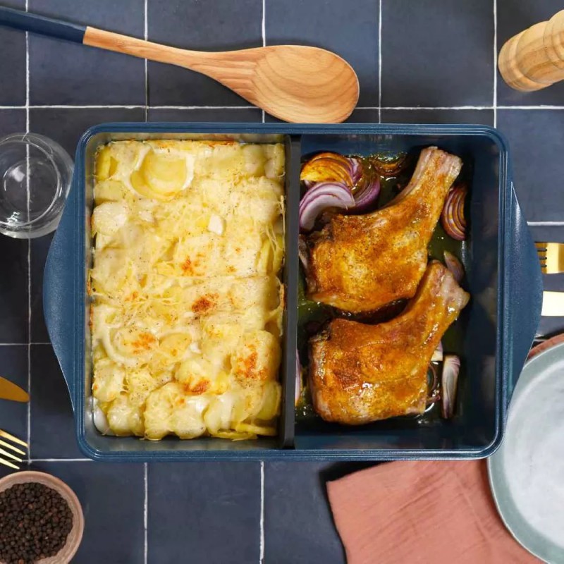 L'Incroyable Plat à Four 2 Compartiments Rectangulaire Bleu Myrtille 40x30 cm de Cookut est un plat à rôtir ingénieux, doté d'un séparateur qui permet d'ajuster la taille du plat, et cuire plusieurs préparations simultanément, en utilisant 1 seul ustensile.