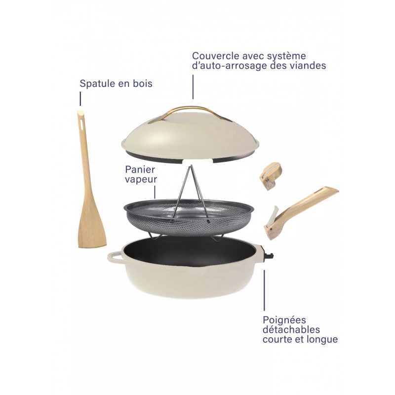 La Fabuleuse Poêle Anti-Adhésive 8 en 1 24 cm de couleur Blanc Meringue 3,4L de Cookut est une poêle polyvalente à bords hauts avec couvercle bombé, qui remplace 8 ustensiles de cuisine, et permet de cuisiner pour 1 à 2 personnes et jusqu'à 6 personnes pour certaines recettes (gâteau, quiches, tartes etc...)Fabriquée en métal 100% recyclé, la poêle Fabuleuse est ultra légère et grantie sans PFOA, pour des cuissons saines. Son revêtement est très résistant et performant, pour une parfaite diffusion de la chaleur.La Fabuleuse Poêle Anti-Adhésive 8 en 1 24 cm Blanc Meringue 3,4L s'utilise comme : - Poêle : Utilisez la sans couvercle et faites cuire des oeufs sur le plat, des omelettes, saisir un morceau de poisson ou de viande.- Sauteuse : Grâce à ses bords hauts, elle est parfate pour faire sauter des légumes, faire revenir des émincés de poulet, préparer un wok etc.- Casserole : Sa grande taille et son couvercle permettent de l'utiliser comme une casserole et cuire des pommes de terre, une soupe ou encore des pâtes et du riz.- Cocotte : Le couvercle est doté de picots qui permet un arrosage automatique des aliments- Cuiseur vapeur : Vendue avec un panier vapeur, la Fabuleuse permet une cuisson vapeur douce des aliments, comme les légumes, poissons, pommes de terre ou ravioles.- Friteuse : Toujours grâce au panier vapeur, vous pouvez cuisiner toutes sorte de fritures, comme les beignets, les tempuras et les frites.- Plat au four : En enlevant les poignées, la Fabuleuse de Cookut se transforme en véritable plat à four et permet de faire rôtir un poulet, ou préparer des gratins. Vous pouvez également la glisser dans le four avec son couvercle pour tenir au chaud toutes vos préparations.- Moule à gâteaux : Toujours utilisée en version plat à four, elle vous permet également de cuire des gâteaux, comme un moelleux au chocolat, un clafoutis, ou même des tartes sucrées et salées.Bref, la poêle Fabuleuse permet donc de cuisiner une multitude de recettes avec 1 seul...
