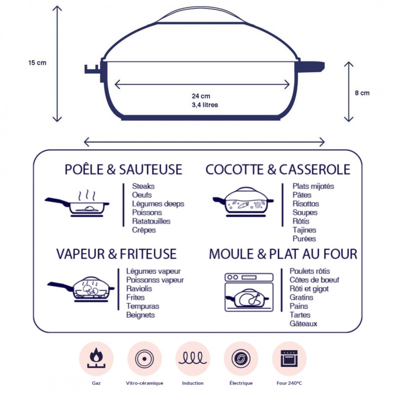 - Compatible tous types de feux y compris induction et four, jusqu'à 240°C