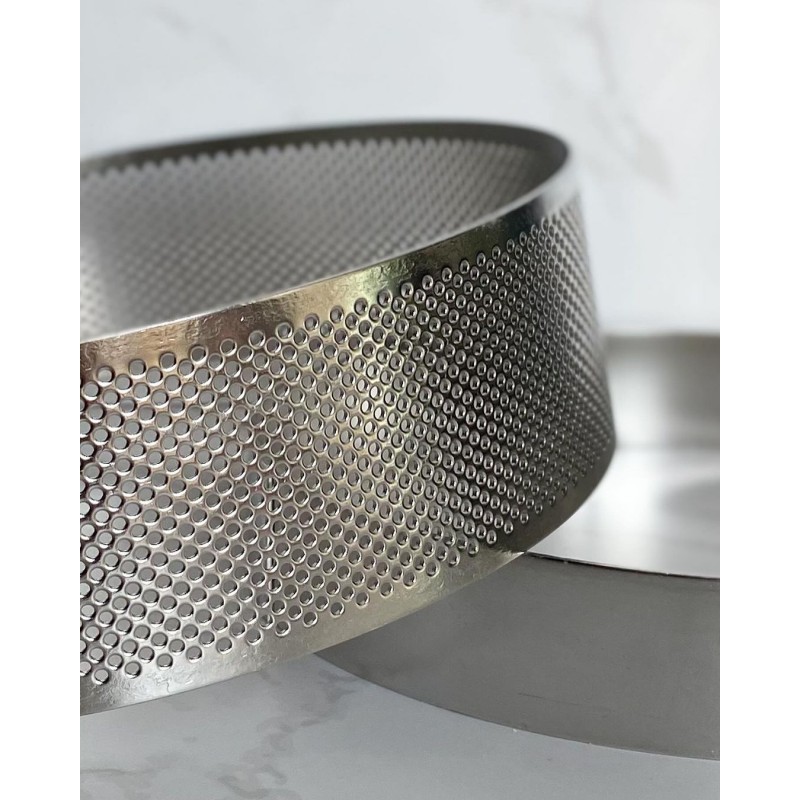 - 1 cercle perforé en inox diamètre 16 cm x hauteur 4,5 cm : permet une cuisson uniforme et une pâte dorée et croustillante grâce à l'air qui circule dans les petits trous.