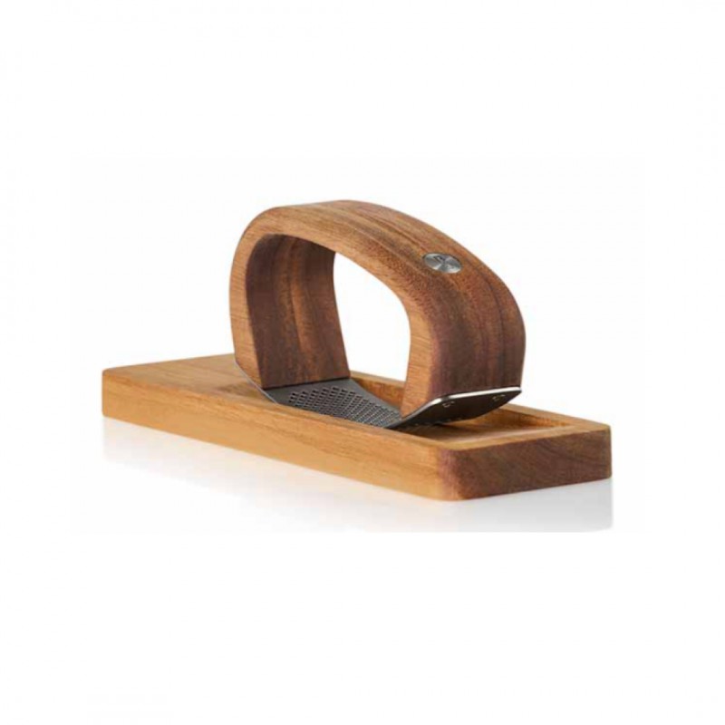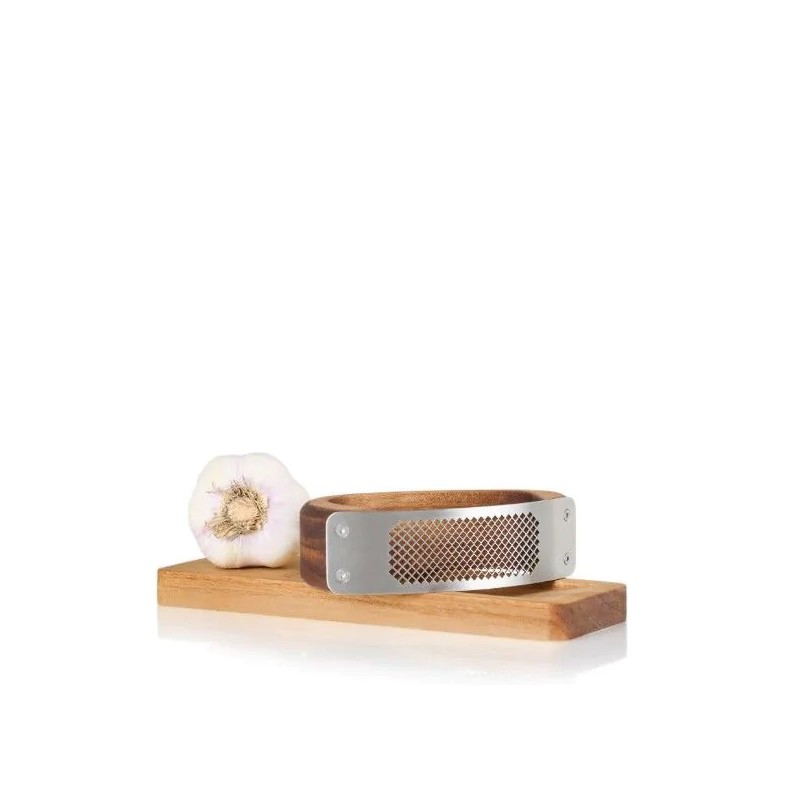 Elegant, le Presse-Ail en Inox Rocca repose sur une jolie planche en bois d'acacia.