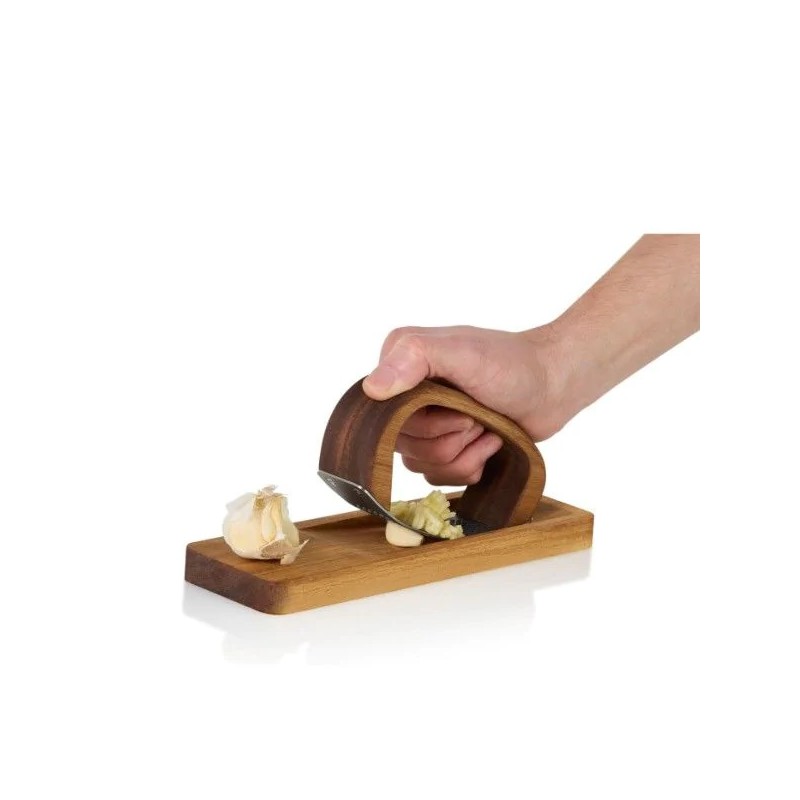 Le Rocca Presse-Ail Inox et Planche en Bois AdHoc est un ustensile de cuisine au design incurvé qui vous permet de presser votre gousse d'ail sans que vos mains ne sentent l'ail.