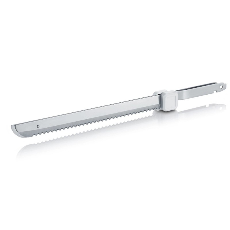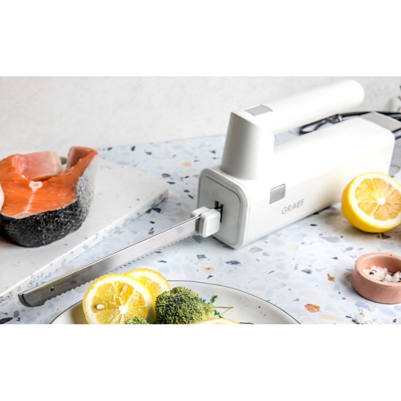 Le Couteau Electrique avec 2 Lames Dentelées en Inox Blanc EK501 de Graef permet de découper facilement et précisément tous types d'aliments comme le pain, les fruits, la viande et même la viande congelée, en tranches régulières.