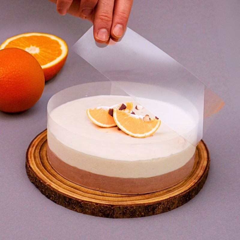 Découpez le film rhodoïd et insérez le dans votre cercle à tarte ou dans votre cadre à pâtisserie pour faciliter le démoulage et obtenir des bords nets et une finition parfaite.