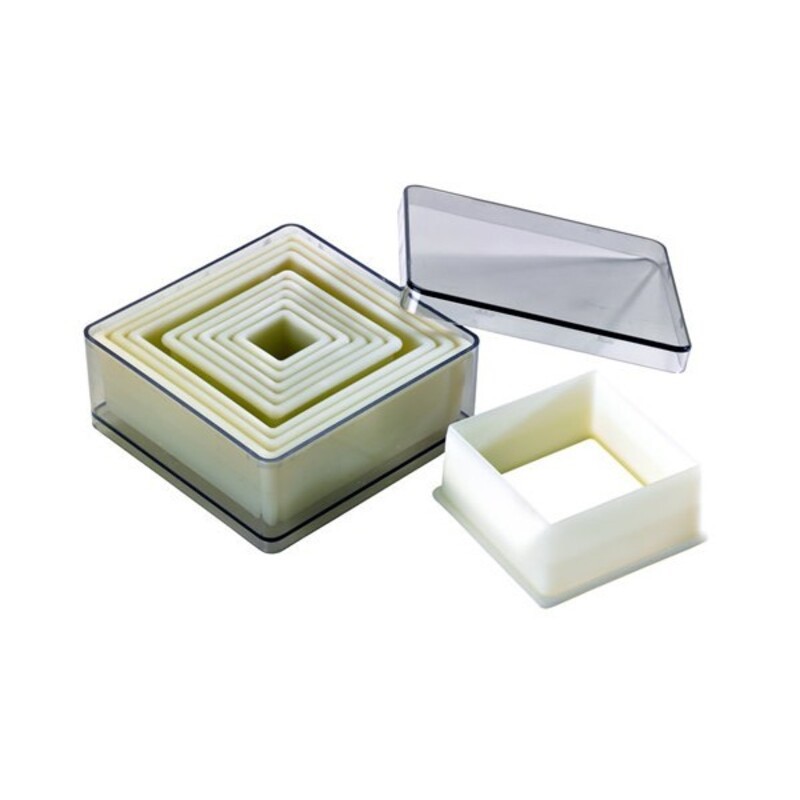 Le Set de 9 Emporte-Pièces Lisses Patisdecor et un ensemble de découpoirs lisses, carrés de 2 à 10 cm , vous offrant une multitude de choix et de taille pour confectionner vos fonds de tarte, entremets, gâteaux individuels et décors.