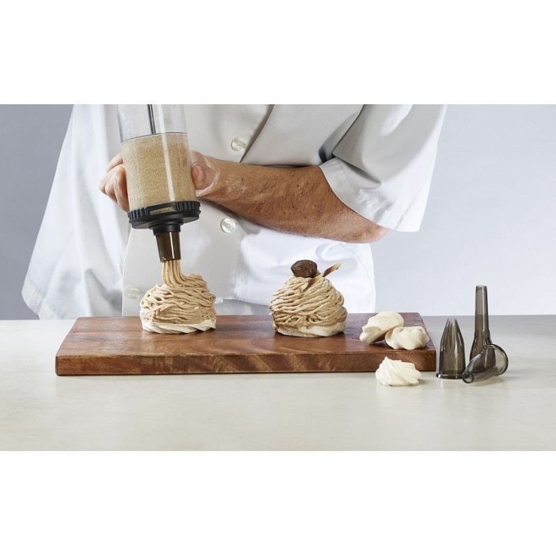 Complété par une douille, il vous aidera à décorer, farcir, remplir et garnir très facilement vos pâtisseries ou préparations salées. Facile à utiliser, il suffit d'insérer une douille et l'appareil désirés à l'intérieur puis de presser le tout en faisant le vide d'air grâce au piston.