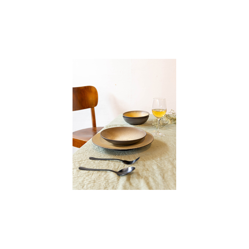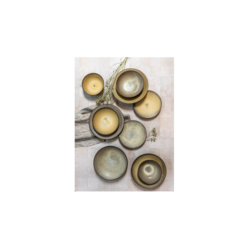 Cette assiette profonde, à la forme d'une coupelle et aux bords extérieurs anthracite, est doté d'un émail réactif mat qui conduit le regard vers l'intérieur et offre un éclat de couleurs vibrantes, mêlant des nuances profondes de jaune, ocre et doré.