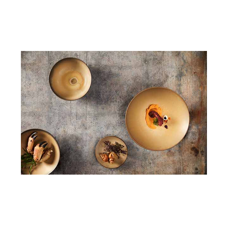 Le Bol Coupe Divine Moon Gris anthracite / Ocre 11 cm, à la forme d'une coupelle et aux bords extérieurs anthracite, est doté d'un émail réactif mat qui conduit le regard vers l'intérieur et offre un éclat de couleurs vibrantes, mêlant des nuances profondes de jaune, ocre et doré.
