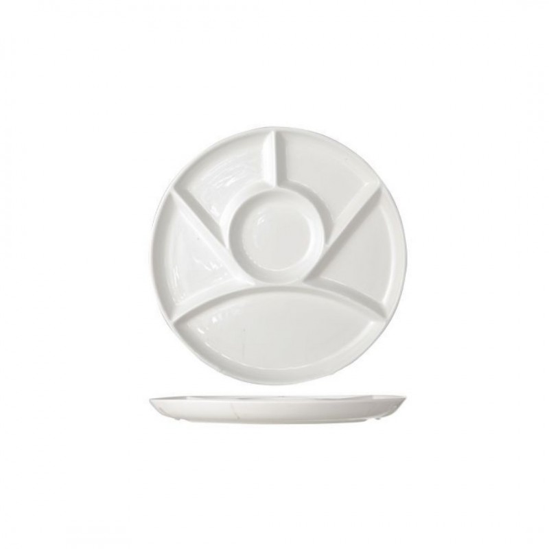 Met zijn 6 ingenieus ingedeelde vakken maakt het ronde bord het gemakkelijk om sauzen, vlees, groenten en bijgerechten te scheiden, voor een nette presentatie en perfecte service.Gemaakt van hoogwaardig wit porselein, past het bord met een diameter van 24 cm perfect bij elke tafelsetting en is het gemakkelijk te reinigen in de vaatwasser.