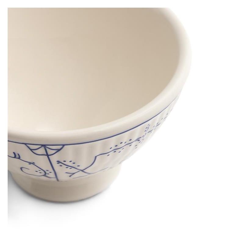 De Copenhagen Cremewit en blauw keramische kom met voet van 11 cm van Royal Boch is een kleine, verfijnde en elegante ronde geglazuurde kom, perfect voor het ontbijt, het genieten van yoghurt, granola, fruit, thee, koffie, enz.