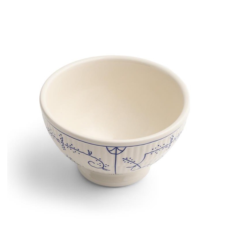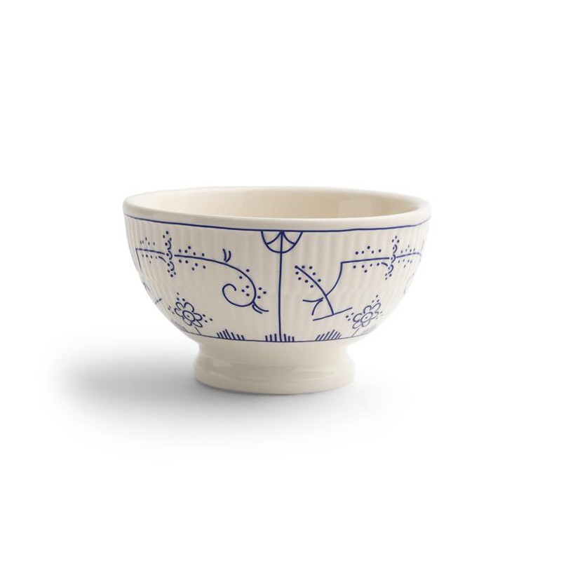 De Copenhagen Cremewit en blauw keramische kom met voet van 13 cm van Royal Boch is een kleine, verfijnde en elegante ronde geglazuurde kom, perfect voor het ontbijt, het genieten van yoghurt, granola, fruit, thee, koffie, enz.