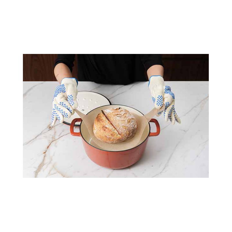 Zeer praktisch: de siliconen bakmat heeft 2 lange handgrepen waarmee u uw bol brood in de ovenschaal of broodvorm kunt leggen, zonder het risico te lopen dat deze vervormt, en waarmee u het goed gebakken brood er na het koken gemakkelijk uit kunt halen. De siliconenmat garandeert een gelijkmatige garing en een lekker knapperig korstje.