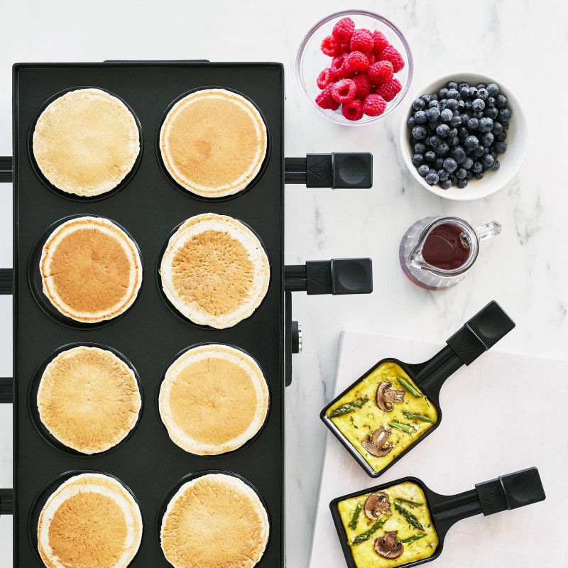 De omkeerbare, PFAS-vrije plaat van gegoten aluminium maakt het mogelijk om 8 kleine crêpes of pannenkoeken te bakken dankzij de speciaal ontworpen vakjes.