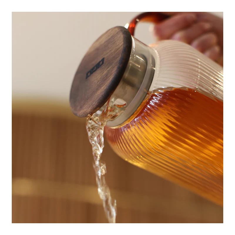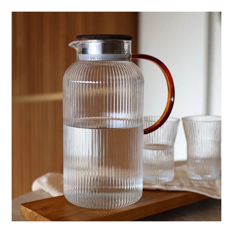De geribbelde borosilicaatglazen karaf met houten deksel van Ogo Living is ideaal voor dagelijks gebruik en past perfect bij je theeritueel.