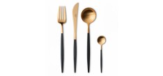 De 24-delige Goa bestekset van Cutipol, in geborsteld goud en met een zwarte handgreep, is een compleet bestekservies uit de Goa-collectie. Het bestaat uit 6 vorken, 6 tafelmessen, 6 eetlepels en 6 koffielepels. Dit bestek uit de Goa-collectie ligt licht en evenwichtig in de hand en brengt je tafel helemaal tot zijn recht, dankzij dat extra vleugje elegantie.