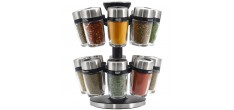 Kruiden : thijm, oregano, basilicum, rozemarijn, peterselie, salie, kurkumapoeder, paprika, marjolein, venkelzaad, dille, komijnzaad, kaneel, munt, chilli, mosterdzaad, koriander en currypoeder Kruidenpotjes in glas en geborsteld roestvrij staal, inhoud 115g Hermetisch afsluitend deksel met 3 standen en label Kruidenpotjes met wijde opening voor gemakkelijk vullen Carrousel met greep, stevige voet en vlotte draaibeweging Uniek ophangsysteem voor de kruidenpotjes Aantrekkelijke geschenkverpakking.