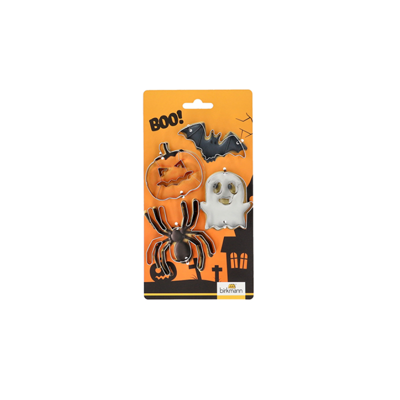 De 4-delige Halloween koekjesvormset: Pompoen, Spook, Vleermuis, Spin is een set roestvrijstalen uitsteekvormpjes met Halloween-thema.