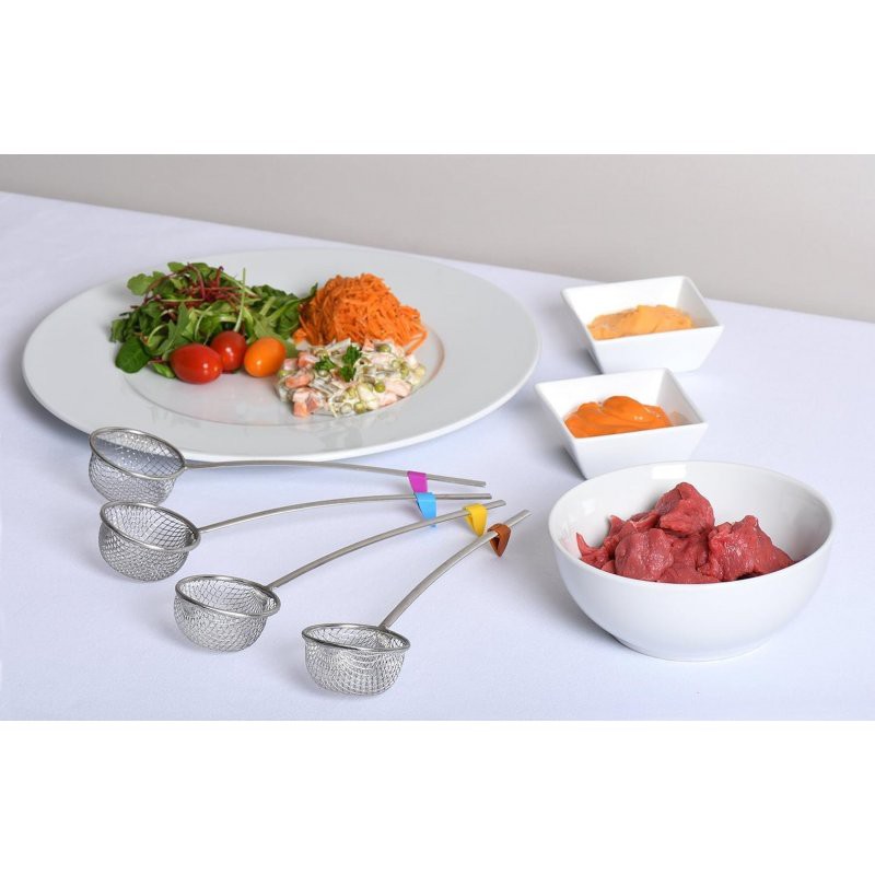 Gemaakt van hoogwaardig roestvrij staal bieden deze fonduemandjes een uitstekende hittebestendigheid, een lange levensduur en zeer eenvoudig onderhoud. Hun grootste troef? De gekleurde clip op elke steel, ideaal om het eigen mandje snel te herkennen en verwarring tijdens groepsmaaltijden te voorkomen.