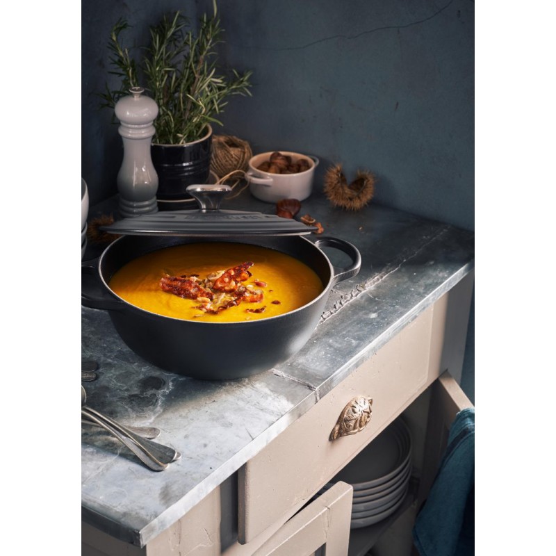 Het geëmailleerde gietijzeren ontwerp houdt de warmte vast voor een gelijkmatige garing en perfect gesudderde gerechten. Het goed sluitende deksel versterkt de condensatie van kookdampen voor een resultaat vol geconcentreerde smaken. Kook op laag of middelhoog vuur om je geëmailleerde gietijzer te beschermen en sensationele resultaten te bereiken.De praktische hittebestendige knop (tot 260 °C) is ontworpen voor een betere grip, zelfs met een ovenwant om het deksel op te tillen.