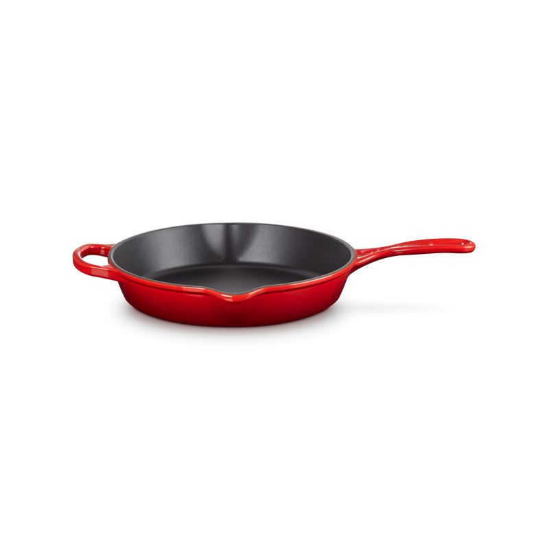 De Le Creuset Skillet Geëmailleerde Gietijzeren Koekenpan 26cm Kersenrood met uitloop, is geschikt voor alle kookplaten inclusief inductie en grill, BBQ en pizzaoven.