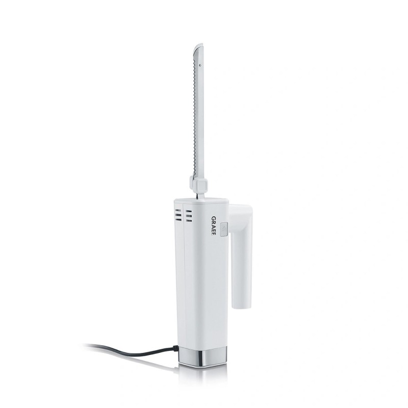 Met het Graef EK501 elektrische mes met 2 gekartelde roestvrijstalen messen in het wit snijdt u gemakkelijk en nauwkeurig alle soorten voedsel, zoals brood, fruit, vlees en zelfs diepvriesvlees, in gelijkmatige plakjes.