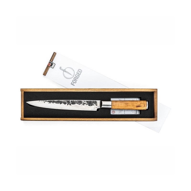Het Olive Forged-messenassortiment is gemaakt van hoogwaardige materialen en is zeer robuust en heeft een verfijnd en elegant ontwerp.Elk Forged-mes is verpakt in een mooie houten kist en is het ideale cadeau voor alle fans van koken en design.