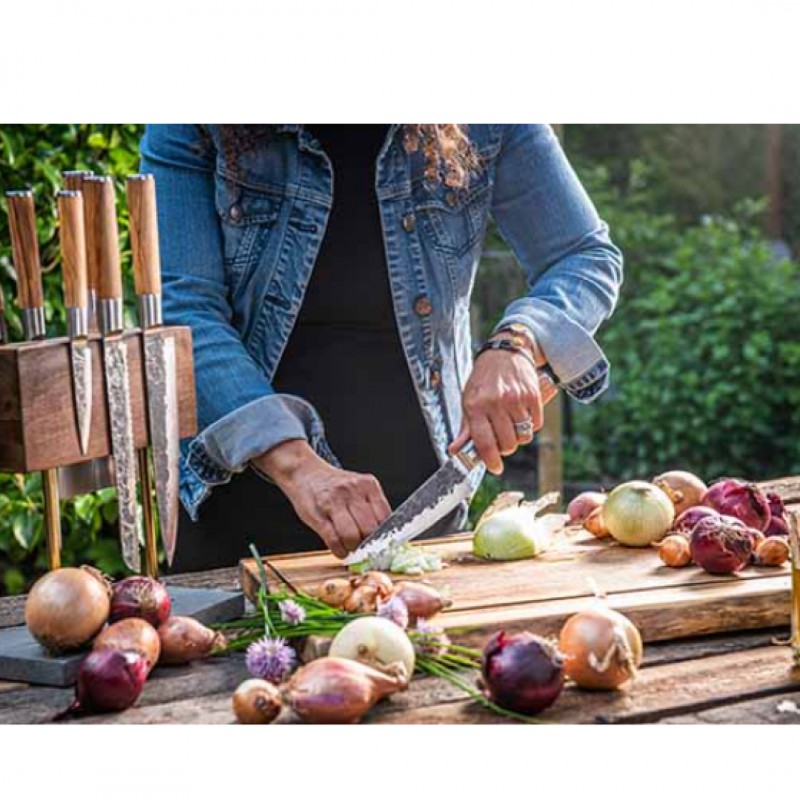 Het Forged-mes, met de hand gesmeed, heeft een gehamerd lemmet van Japans staal, 2 mm dik, voor nauwkeurig en perfect snijden. Uitgerust met een prachtig ergonomisch handvat in natuurlijk olijfhout met afgeronde punt, biedt het Olive Koksmes 16 cm uitstekende grip.