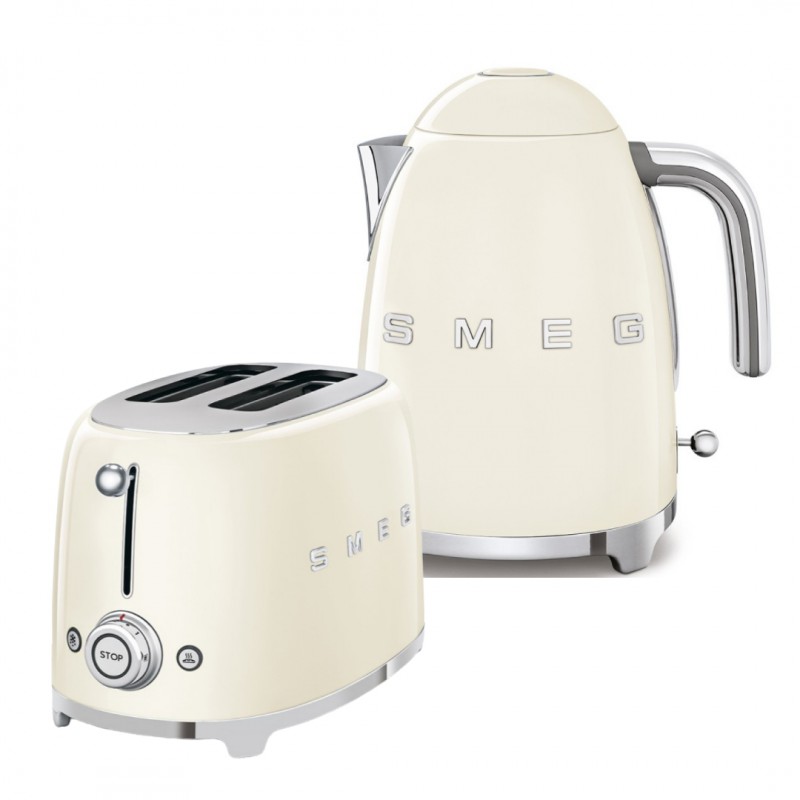 Met zijn retro jaren 50-stijl en elegantie worden kleine Smeg-apparaten ultra-designaccessoires voor uw keuken! Het Smeg Breakfast Essentials-pakket, met een vintage look en ronde vormen, heeft een zachte crèmekleur met chromen details.