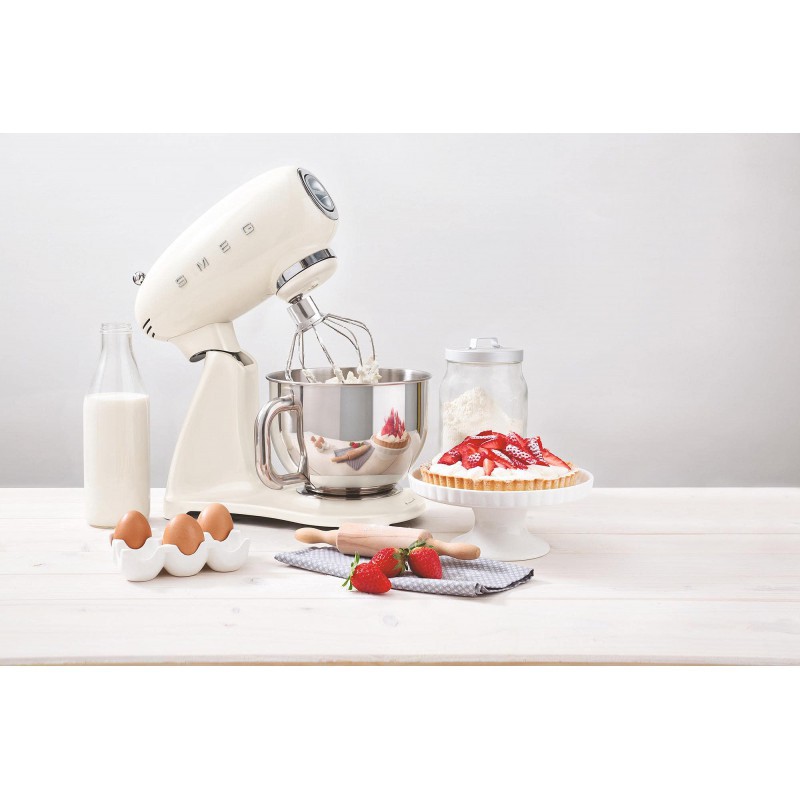 De SMF03 Crèmewitte mixer, uitgerust met een motor van 800 W met 10 snelheden en planetaire beweging, kan mixen, kloppen en kneden dankzij de meegeleverde accessoires: