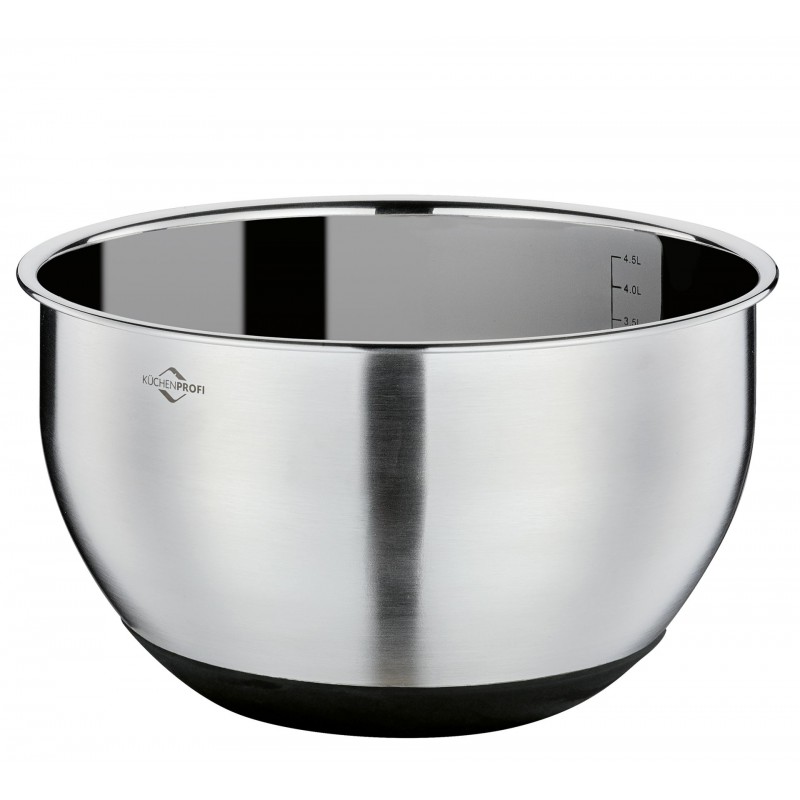 De Küchenprofi roestvrijstalen mengkom van 24 cm (4,8 l) met antislipdeksel met schaalverdeling is een perfecte halfronde kom voor het kloppen van eiwitten of slagroom, omdat de vorm zorgt voor een uitstekende beluchting tijdens het mixen.