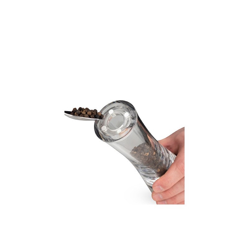 Dankzij het strakke, transparante ontwerp zonder middenas kunt u altijd controleren hoeveel peperkorrels er nog over zijn, en het gebruiksgemak en de vulling zal u sprakeloos maken.