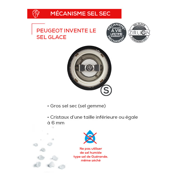 De zoutmolen is uitgerust met het gloednieuwe Zirlion Peugeot-mechanisme: het eerste zirkonia-mechanisme, het meest efficiënte ter wereld. Het robuuste en duurzame Zirlion-mechanisme, met levenslange garantie, zorgt voor een uiterst nauwkeurige maling, van ijskoud zout met uitzonderlijke finesse tot knapperig zout. Het is gemaakt van zirkonium en biedt een uitstekende corrosiebestendigheid, zelfs in ruimtes met een hoge luchtvochtigheid. Het is gemaakt van zirkonia en biedt een uitstekende corrosiebestendigheid, zelfs in ruimtes met een hoge luchtvochtigheid. Bovendien kan het een grote verscheidenheid aan droge zouten malen.
