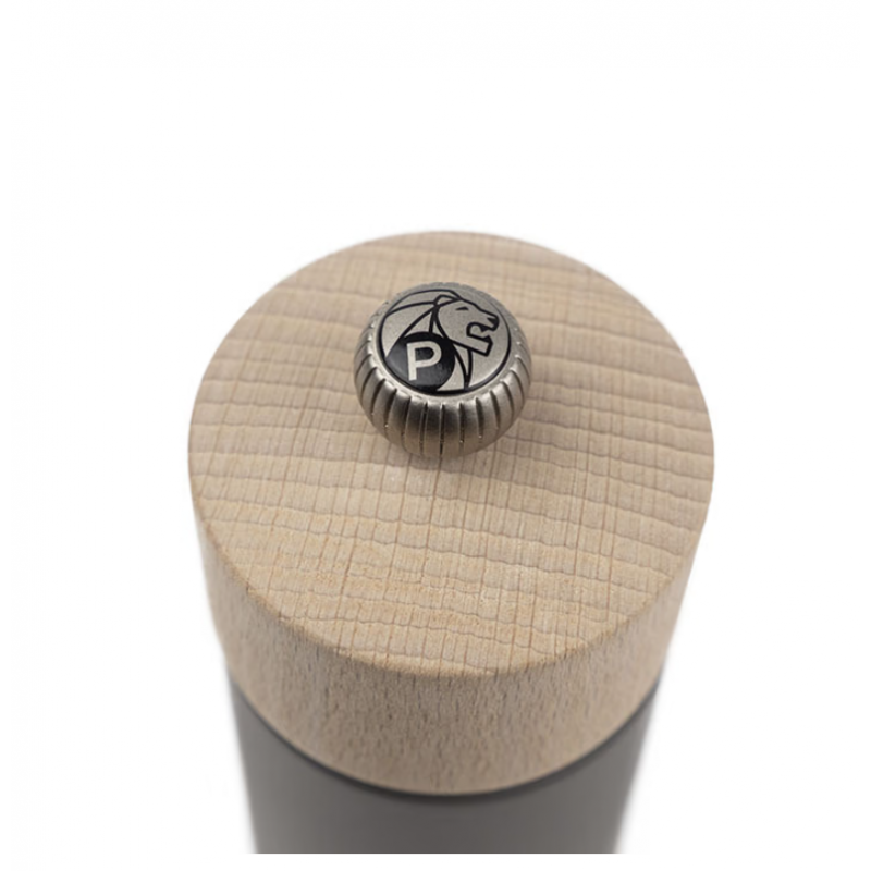 Deze in Frankrijk vervaardigde pepermolen herbergt het beroemde Peugeot-mechanisme, gegarandeerd zonder tijdslimiet. De knop erboven, gemarkeerd met de voetafdruk van de leeuw, maakt een eenvoudige aanpassing van de maalgraad mogelijk.